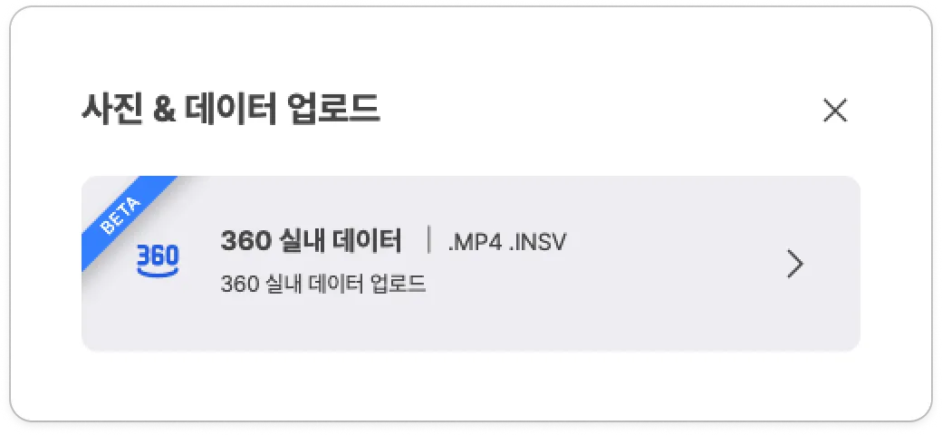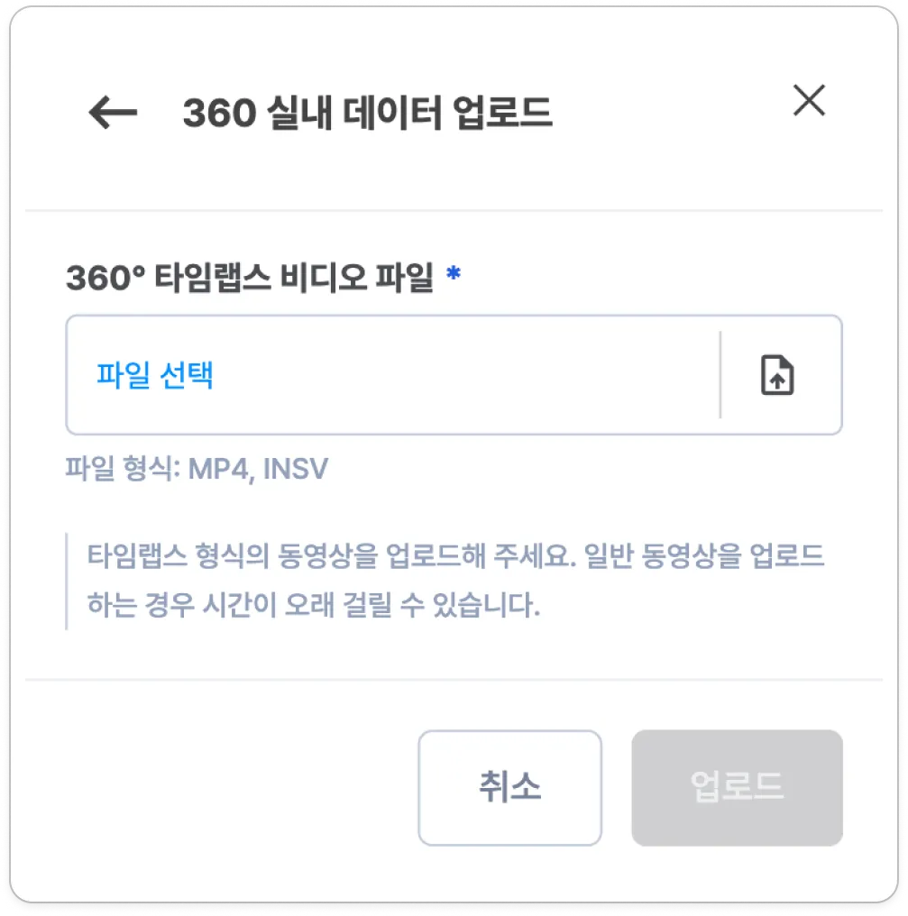 * INSTA 360 X3로 촬영한 INSV 파일은 하나의 MP4 파일로 변환 후 업로드해주세요. 추후 X3로 촬영한 두개의 INSV 파일을 한꺼번에 업로드할 수 있도록 개발 예정입니다.