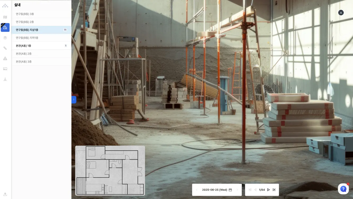 파노라마 영상에서, 좌측 패널을 열어 다른 층으로 이동할 수 있습니다.