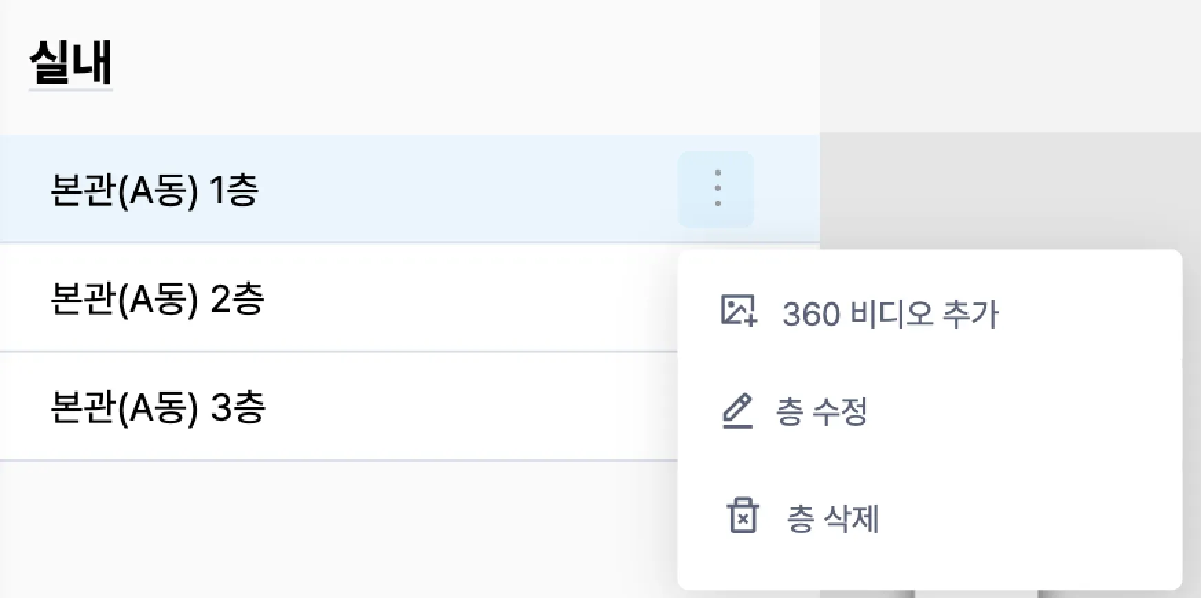 층 오른쪽의 더보기 메뉴(⋮)에서 ‘360 비디오 추가’를 선택하세요.