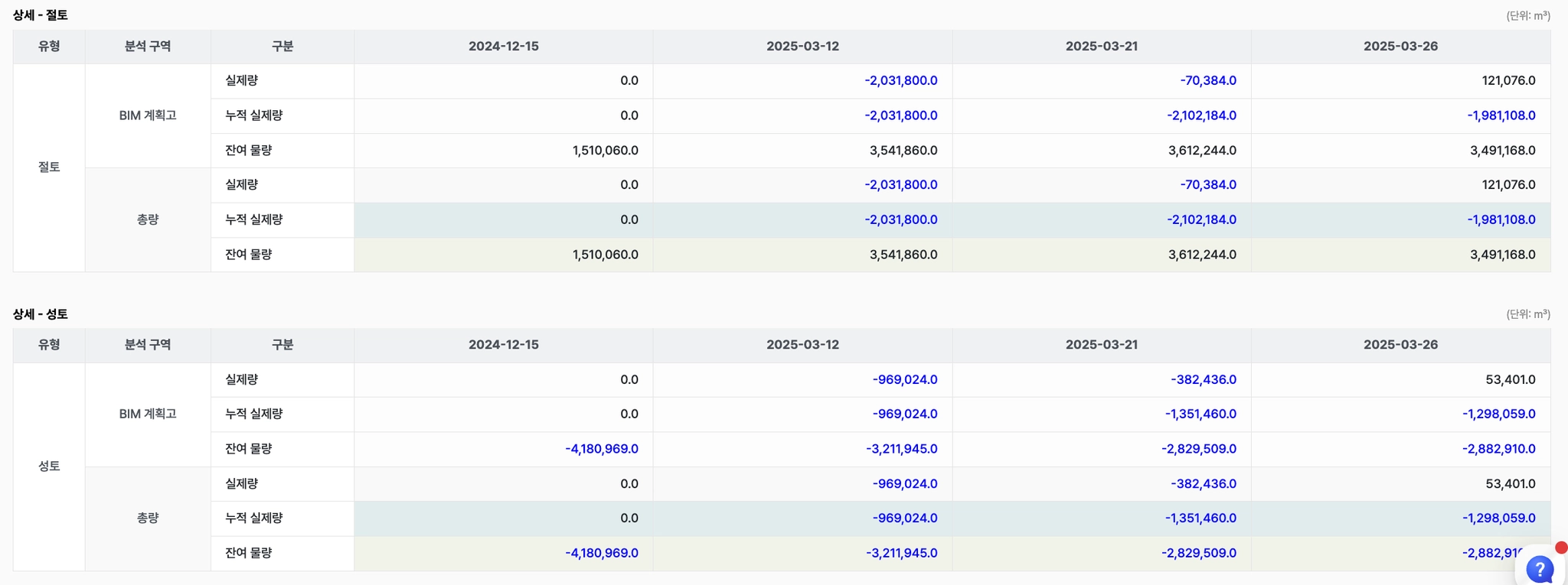 → 세팅해논 계획고, 암 등을 기준으로 원하는 날짜와 비교하여 절,성토량을 계산한 리포트가 출력됩니다.!