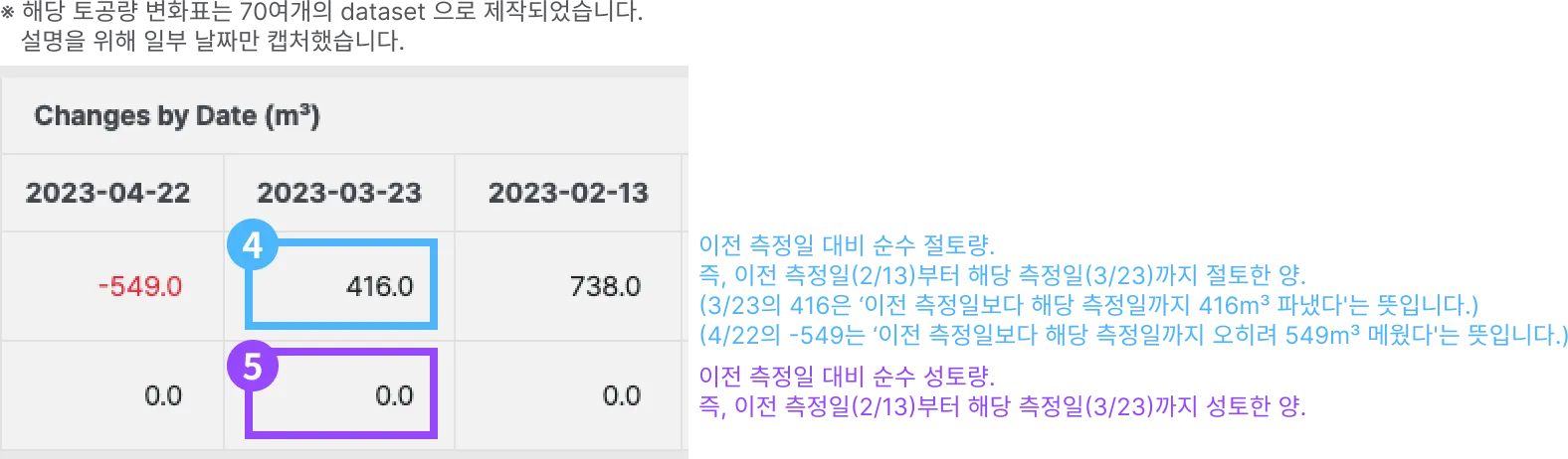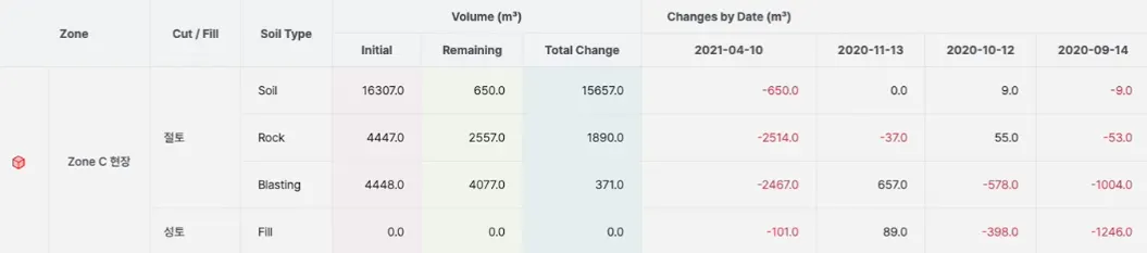 기존에는 매번 특정 날짜의 부피를 개별적으로 측정해야 했지만, 이제는 여러 시점의 측량 데이터를 한 번에 비교하여 토공량 변화를 표로 쉽게 확인할 수 있게 되었습니다.