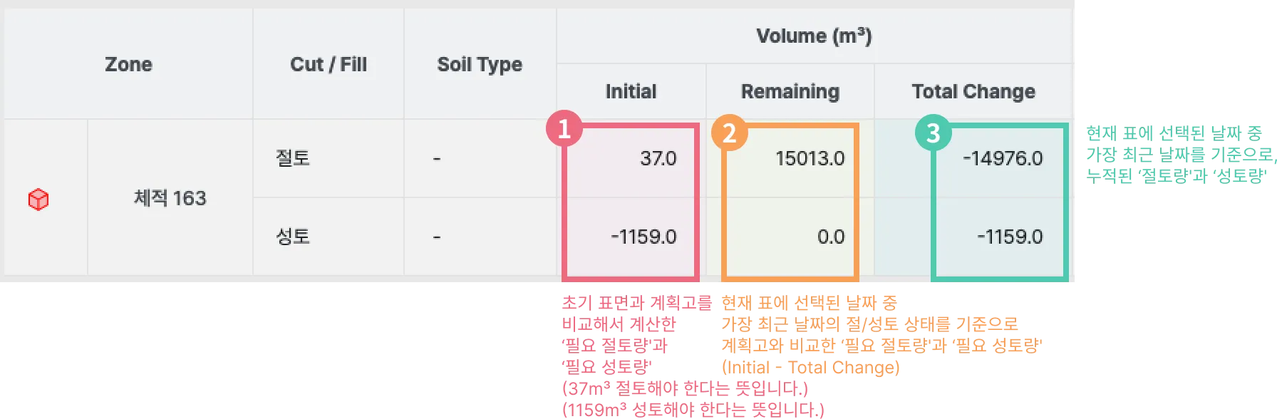 * 초기 표면: 목표치에 도달하기 위해 얼마나 절성토 해야 하는지 비교대상이 되는 초기 값입니다.