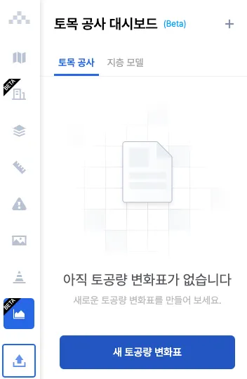 ‘토공량 분석’ 탭에서 ‘새 토공량 변화표’ 버튼을 클릭해 주세요.