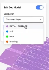 실제 지층 정보를 반영한 지층 모델을 적용하면 토공량 계산 시 암반, 토사 등 각기 다른 암석별로 절/성토량을 계산할 수 있습니다.