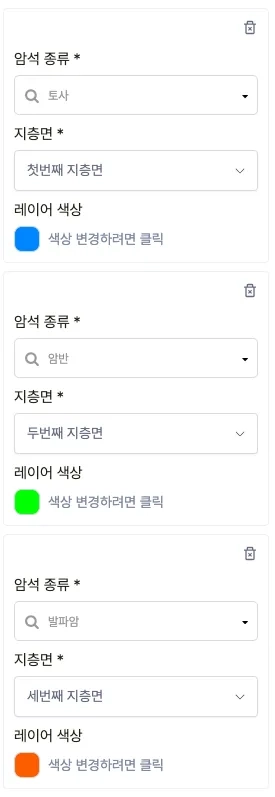 지층 모델 정보에 암석층별로 ‘암석 종류’와 ‘지층면’을 선택해 주세요.